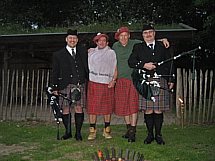 Saunagelände und vor der Sauna in voller Montur den Dudelsack